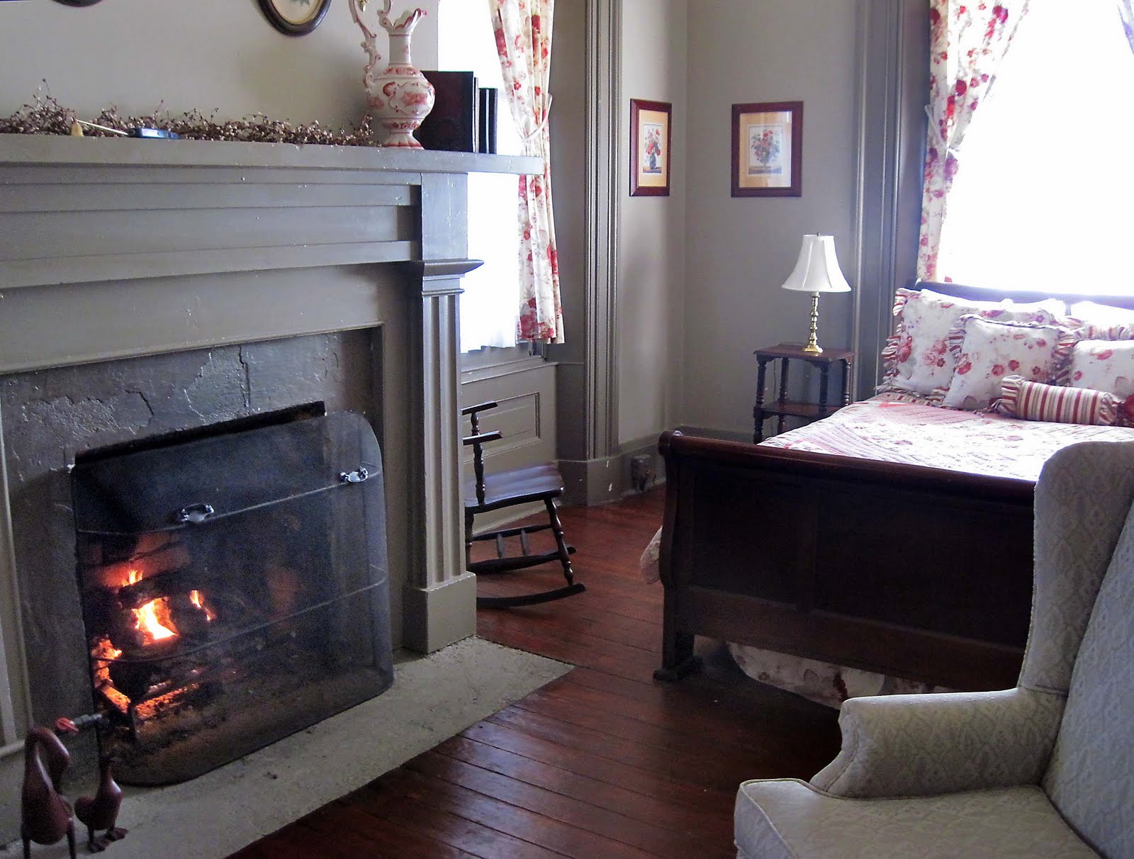We’ve been to a lot of Virginia inns, many of them quite upscale. Oh, not of the Inn at Little Washington caliber, since that’s way out of our budget. But many places with the pricey antiques and the trillion thread count linens and the spa bathrooms and the his-and-her robes. The Lafayette Inn isn’t quite like that. It’s an old building, owned by a lovely couple trying to provide a quality experience without breaking the bank. So it’s a bit quirky. Some of the antiques are pricey, and some look like Sears circa 1963. No robes, nothing-too-special linens, the room was chilly, the fan in the small bathroom squealed, and the hot water ran out mid-shower. But the hosts were friendly and enthusiastic, they brought us a split of champagne and some gourmet chocolates as a welcome gift, and the gas fireplace worked like a charm. My husband and I have been married for 33 years. We enjoy spending these little getaways together. We’re not overly sensitive to things like noisy plumbing or rumbling street traffic or creaky floorboards. Just give me a room with charm and a working fireplace and a bottle of wine and a good book, and I’ll be happy all day.