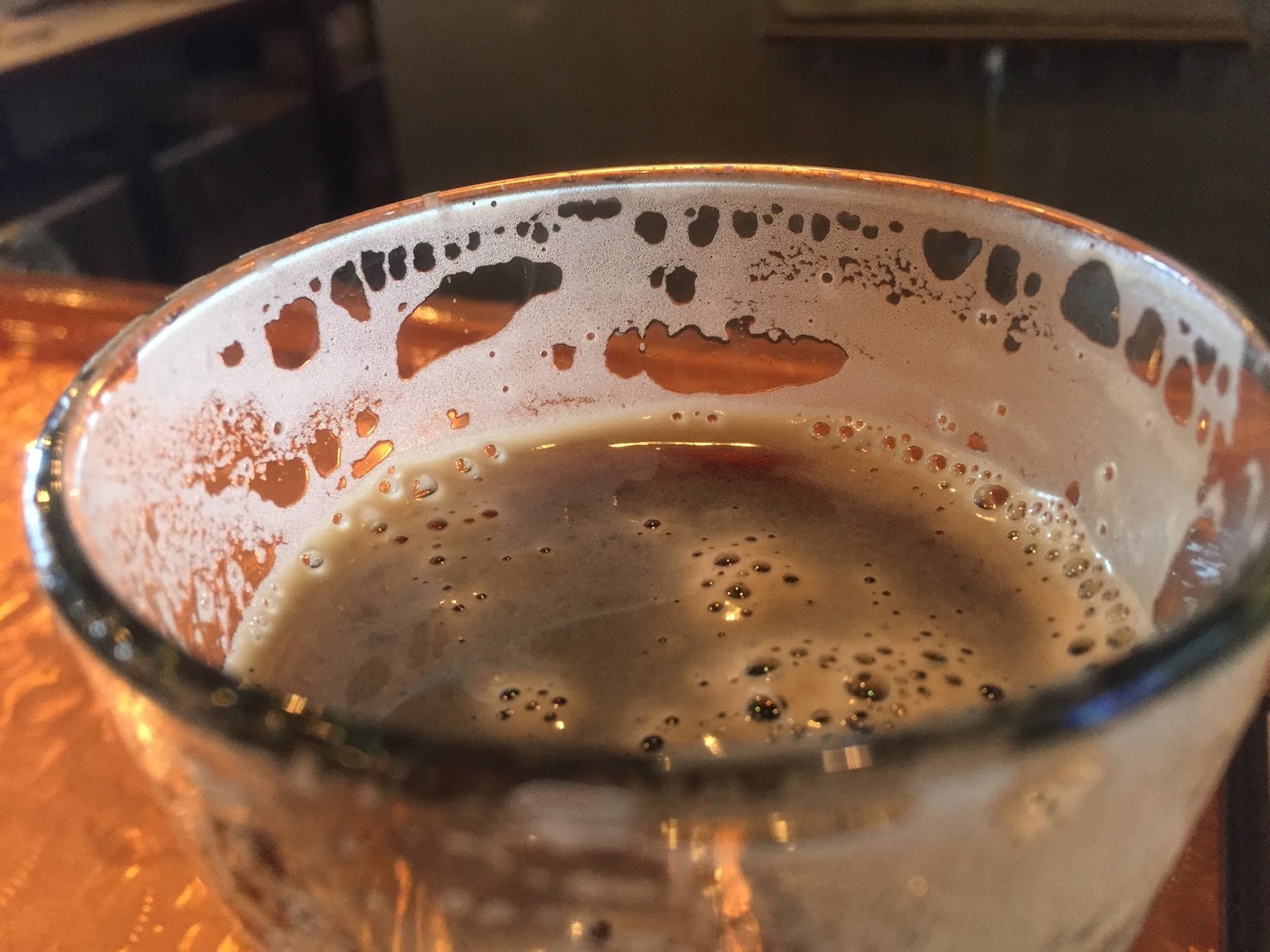 After grabbing some “loaded” fries from the food truck out back, we tried some of the other Tin Cannon beers. I ordered a Busted Pipe Black IPA to try next, and it was an excellent choice. The strong bitter hop flavor was somewhat surprising at first — the initial impression was likely influenced by the smooth caramel and dark fruit sweetness of the previous beer. By the second or third sip I was thoroughly enjoying the beer. This is probably one of the most richly flavored Black IPAs I recall having. The persistent off white head led to attractive lacing on the glass, from top to bottom.