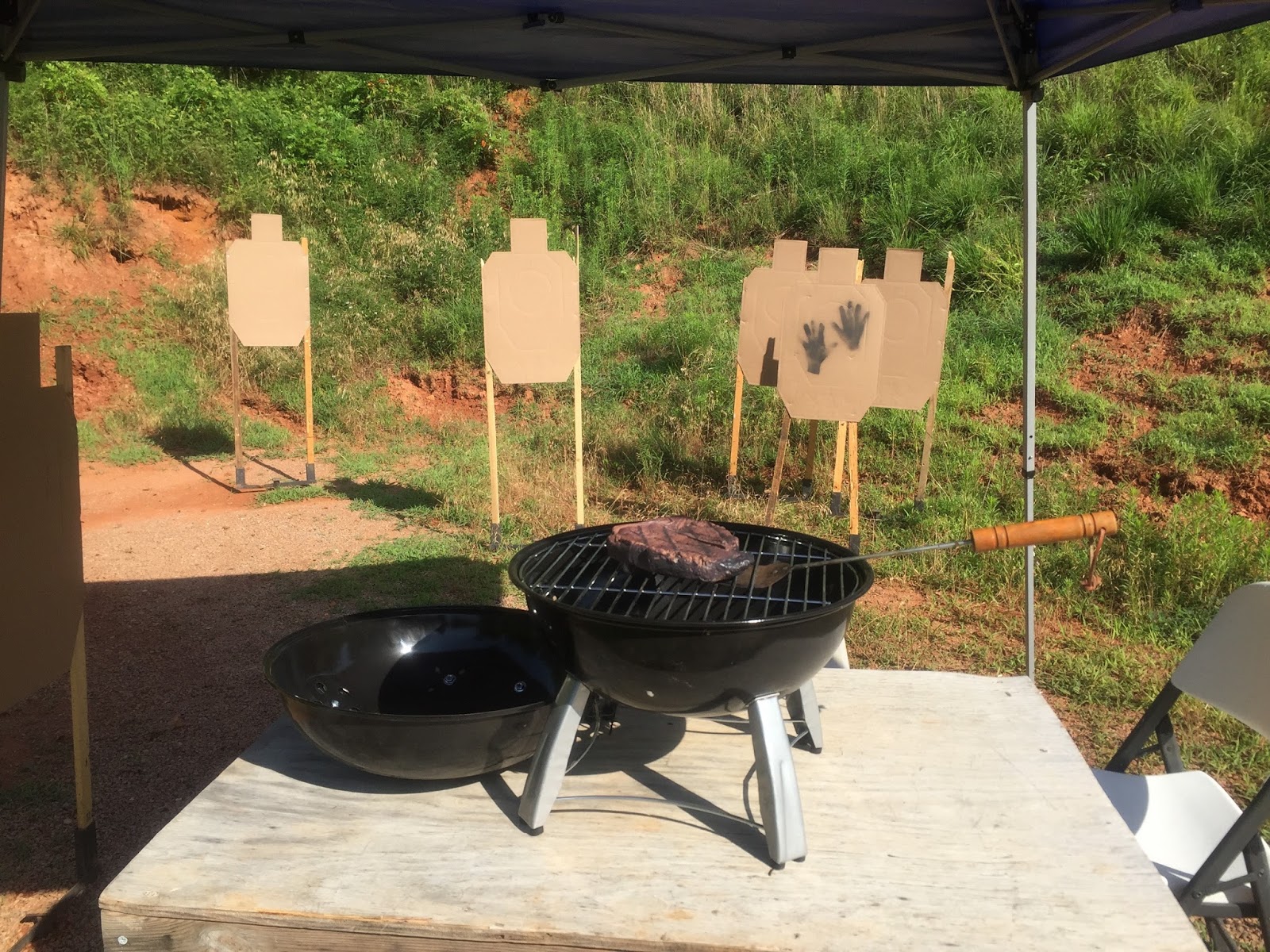 The first stage consisted of two separate strings of fire. We started standing at the grill, “cooking” a steak, with our strong hand on a spatula. There were four targets to be engaged in tactical sequence. For the second string, we took a seat at the table and placed the gun in a lidded box. For this string we shot four more targets, near to far, while seated. The last target of the string was well-hidden behind a barrel requiring a hard lean to hit it.