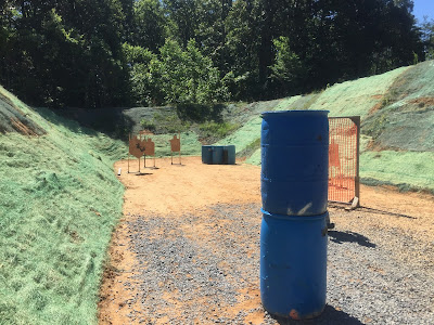 Following that challenge, we moved to a stage shot entirely on the move. There were three open targets downrange beyond three barrels arranged in a triangle about 7 yards apart. We were allowed three magazines loaded to six rounds each. Two shots were put on each target, while moving around the barrels in three directions; across, forward, then backing up, with a reload at each direction change.
