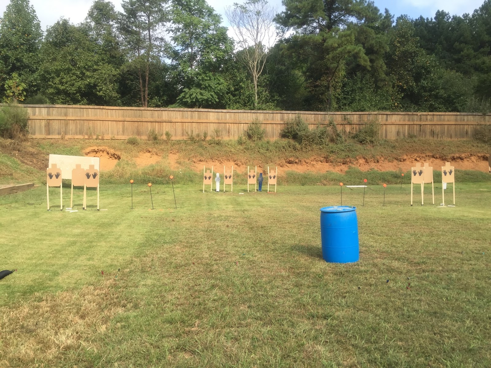 The last stage was a quick course of fire set up in the plinking range. There were eight paper targets, arranged in pairs. They were set at an angle to each other, with a non-threat in the front. The targets were engaged from the outside of two barrels set on either side of the bay. Only four of the targets were visible from either side. This was a fast and fun stage to shoot.