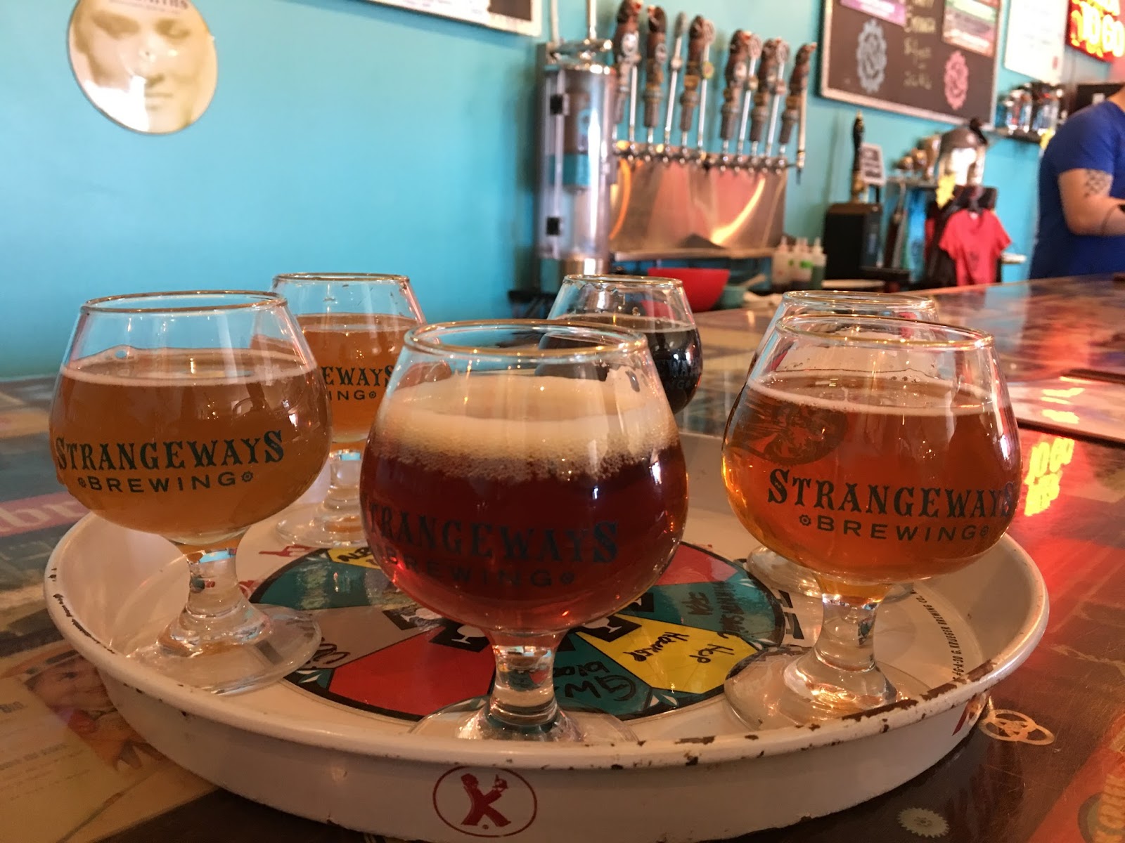 By David From http://www.musingsoverapint.com/ • Feb 16th, 2017 • Category: Blog Entries.LocalAfter we finished up a fun-filled hour at the range, Colleen and I headed over to our next planned stop, Strangeways Brewing. We don’t get down to Richmond often, and this place has been on my “need to do” list for sometime. Strangeways has 36 beers on tap, so deciding where to start was an issue. The friendly bartender suggested we start with the “Nucleus Flight” consisting of six of the brewery’s core beers.