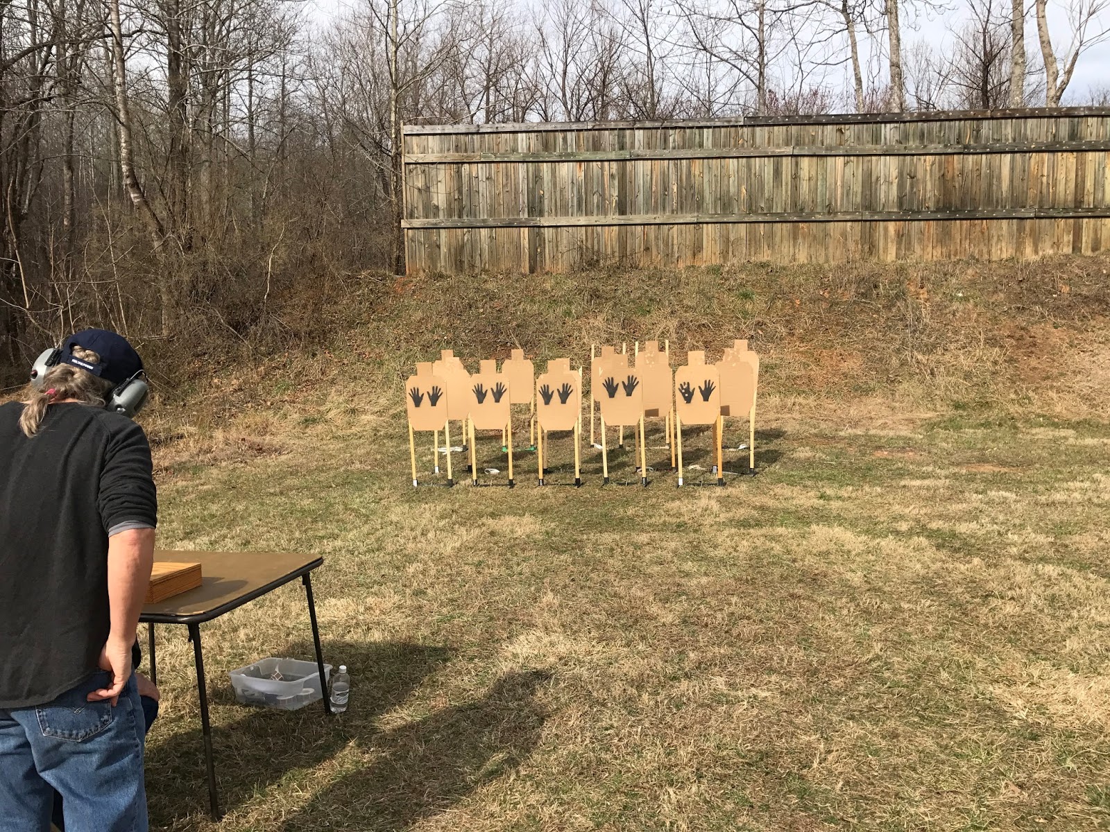 The Match Director set up four extremely challenging stages. The first stage had us seated at a table, with the loaded gun in a box, and spare magazines on the table. There were two rows of targets placed behind a row of non-threats. Copious leaning in the chair was required to see all targets. Head shots were not required, but for all intents and purposes, heads shots were the safest option to avoid the non-threat targets.