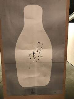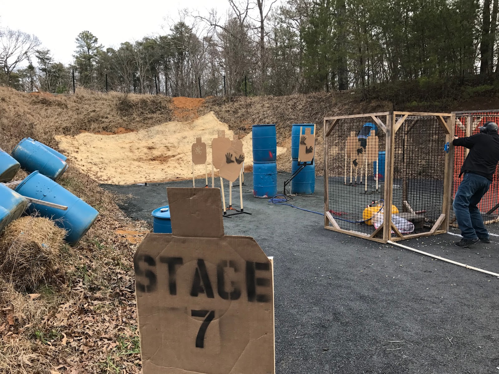 Next we moved to a stage with a line of six targets, each requiring three hits, at least one of which must be a head shot. Adding to the challenge was the placement of non-threats lined up behind the targets. You had to shoot the targets from just the right angle to avoid a shoot through to the penalty targets.