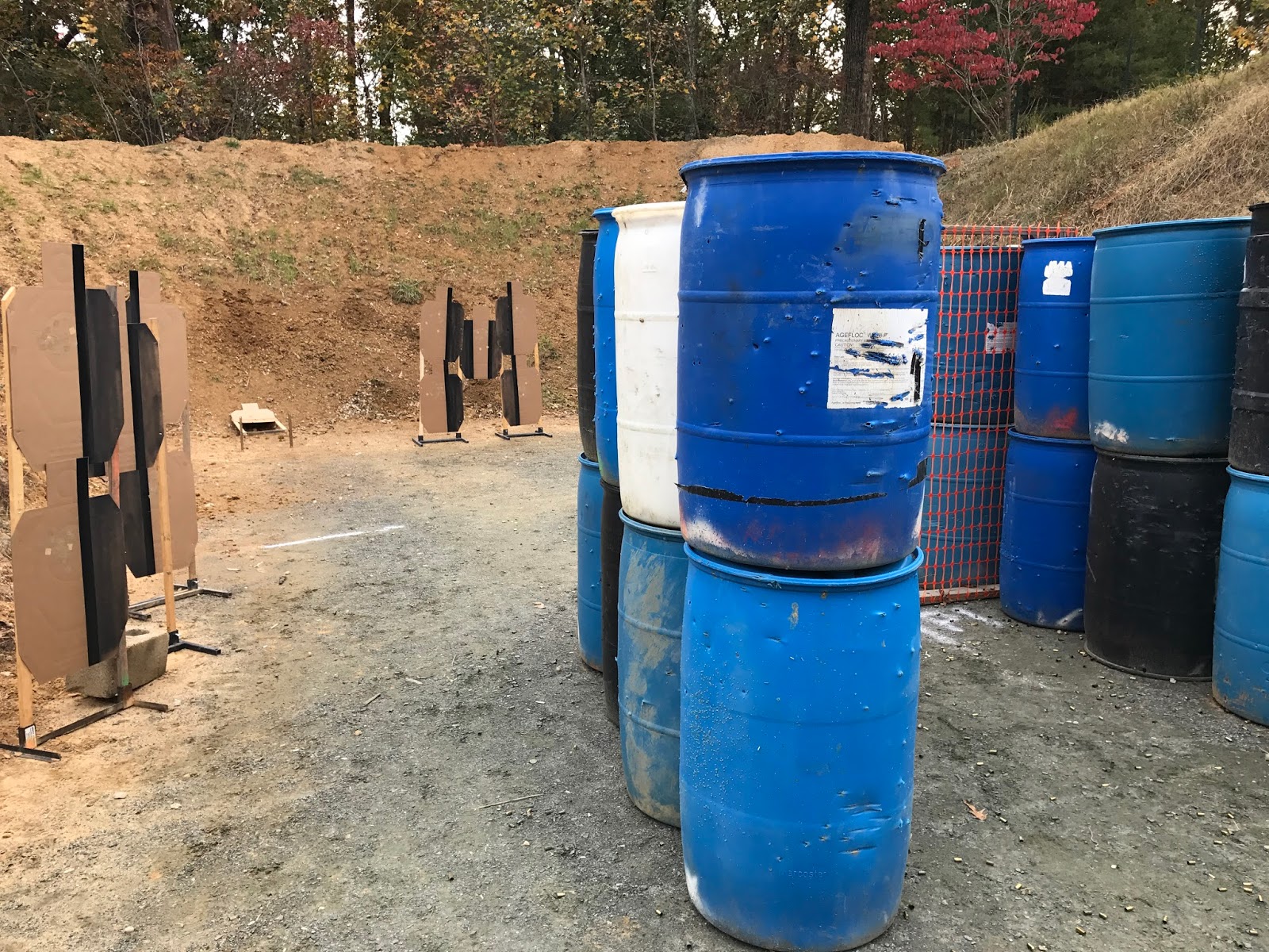 The penultimate stage of the morning had the most movement required of the day, with five threat targets shot from three points of cover. A wide swing with the gun was required for the first three targets shot from cover, two of which were partially blocked by non-threats. Moving down range to the left we found a target near some barrels, then crossing the final position another partial target was engaged. Interestingly I opted to shoot two make up shots, on the second and fourth targets despite, as it turns out, already having two -0 hits on each — gotta learn to have confidence in my shooting.