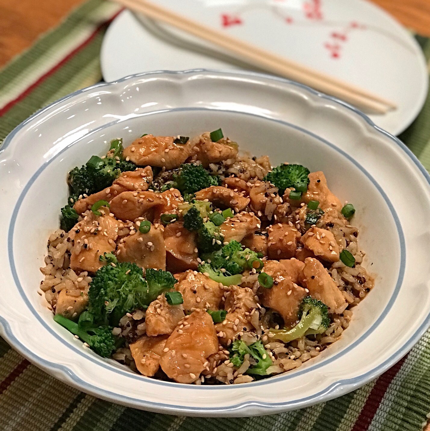 When cook time ends, turn off the Instant Pot. Use a quick release to vent steam. After valve drops, carefully remove lid. Stir in sesame oil and honey. In a small bowl, whisk cornstarch and water until smooth. Add to the Instant Pot and select Sauté/Simmer, stirring constantly until the sauce thickens. Stir in scallions and serve over rice with steamed broccoli, if desired. Garnish with fresh scallions, if desired, and sesame seeds. Enjoy! If you’d like a printer-friendly version of this recipe, Click Here.