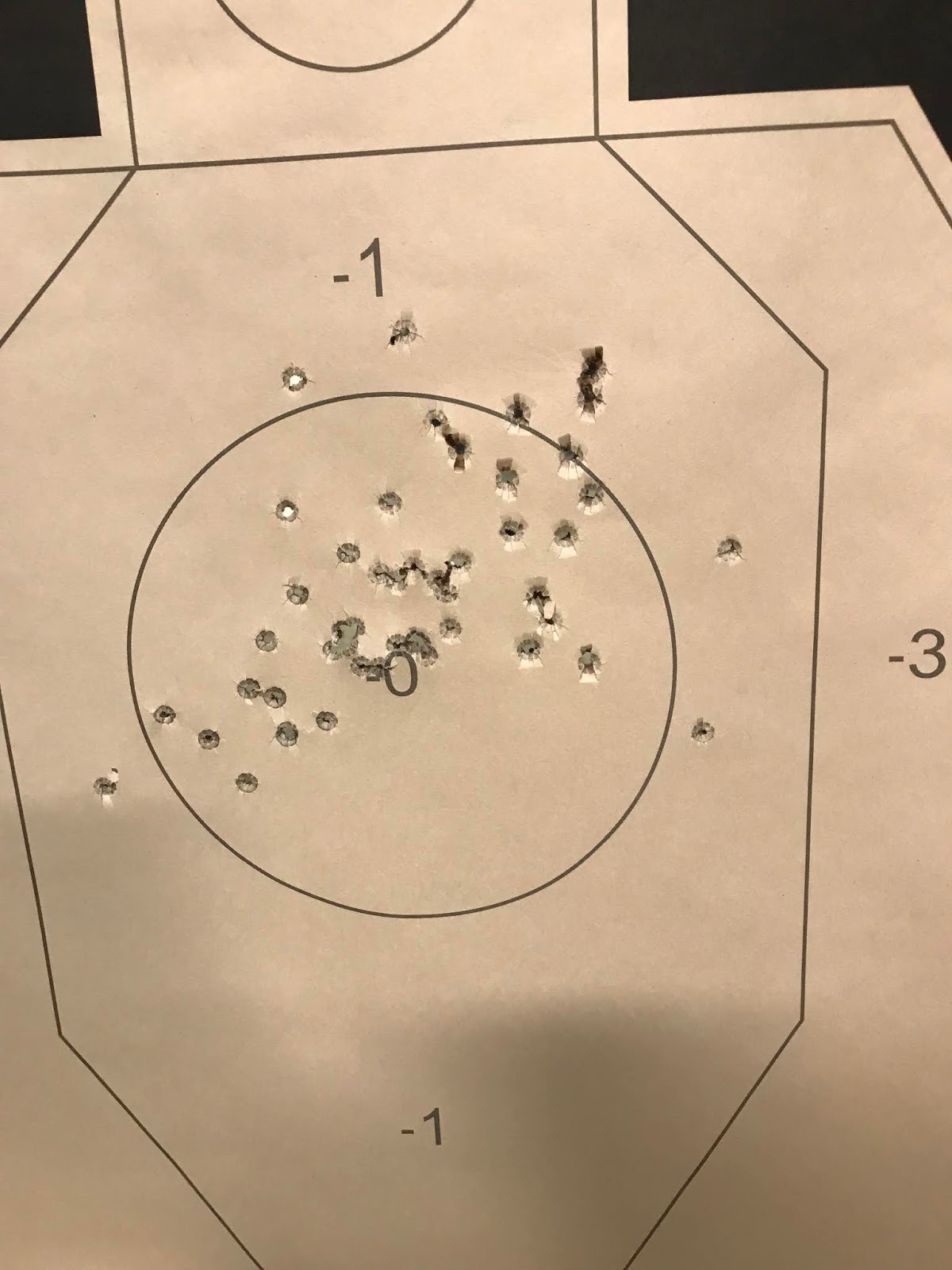Stage 3 consisted of two quick strings. For the first string we had a close line of five threat and two non-threat targets to our left. To the right, a lone target much further away. After shooting that string, we moved to stand centered on a wall. Behind the wall were two targets set behind a non-threat. Each required two body shot and one head shot; the left target from the left side of the wall, the right target from the right. I shot the stage -2, both points dropped on the first string.