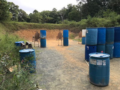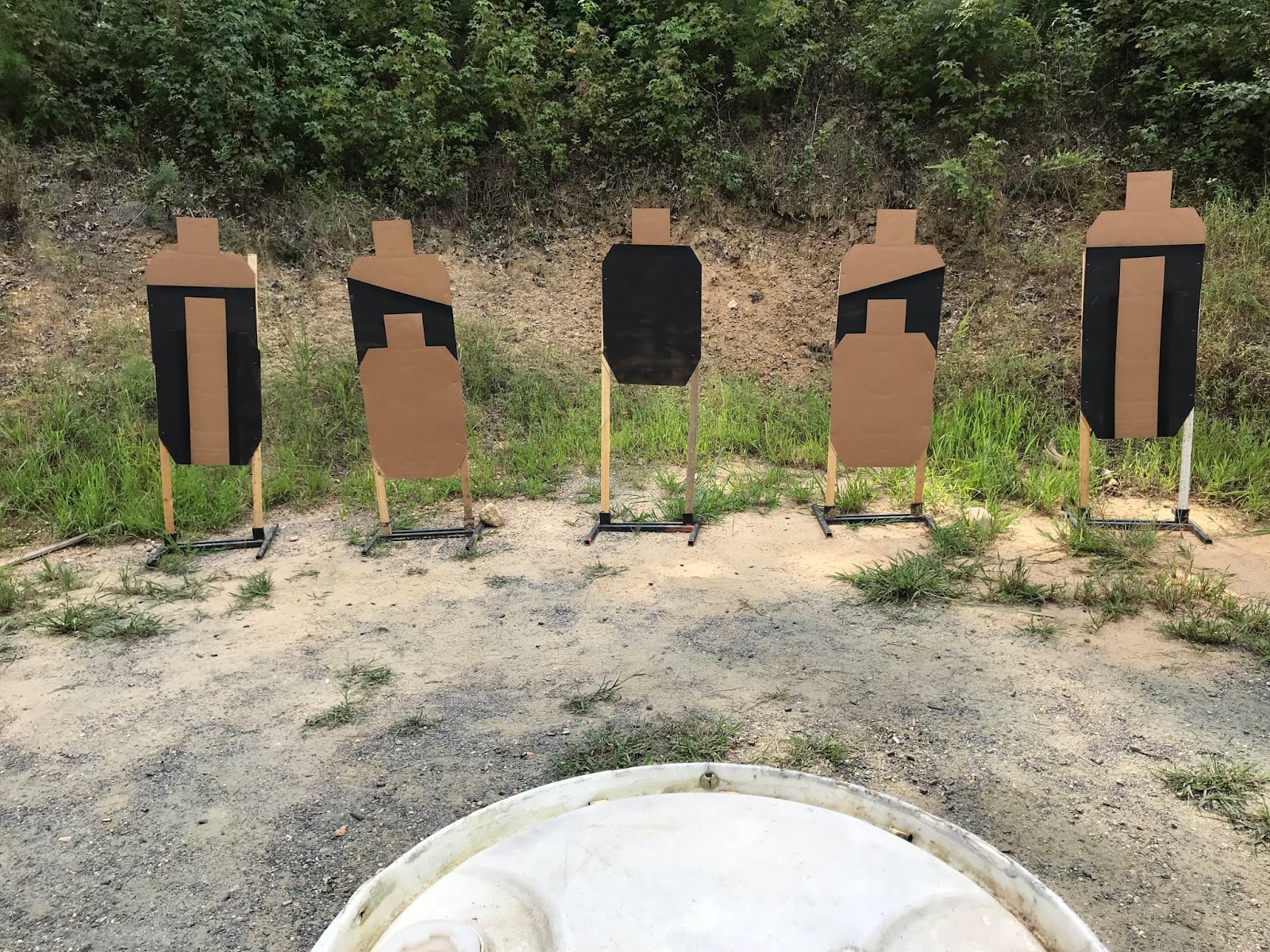 “Last Man Standing” was next for us. Starting at either end of a wall of barrels, a nearly symmetrical arrangement of targets was to found around either end. There were two pieces of steel to be engaged as well. The steel was painted beige to match the cardboard targets, and the earthen berms, and placed in front of a cardboard target. Some of the targets on either side required a challenging lean around cover in order to engage.