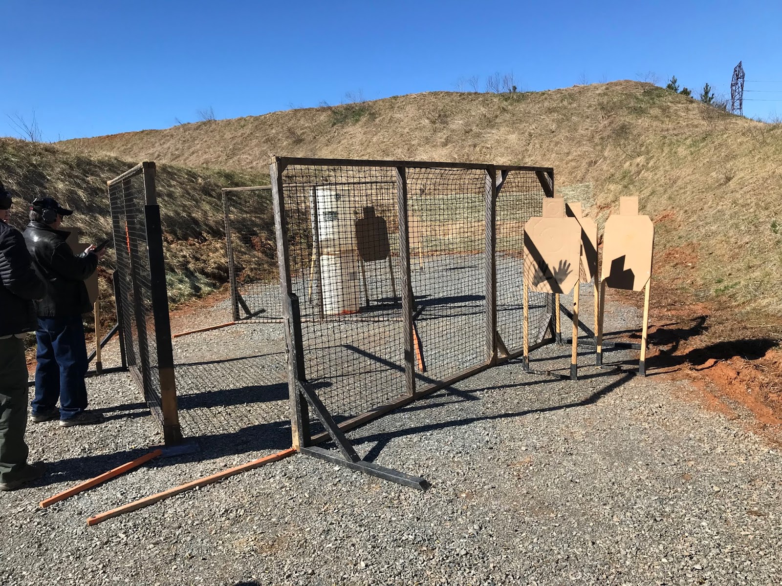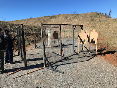Next up was a course of fire that started at an arm’s length target requiring two body and one head shot. Following that we zig-zagged around the walls to near and far targets from cover. Some of the targets required hard leans around cover. Since the “walls” are open netting, on one of those positions I was actually able to stick the gun around the corner and “point shoot” the target while looking through the fence. Although not my best placing stage, I shot the stage just one point down.