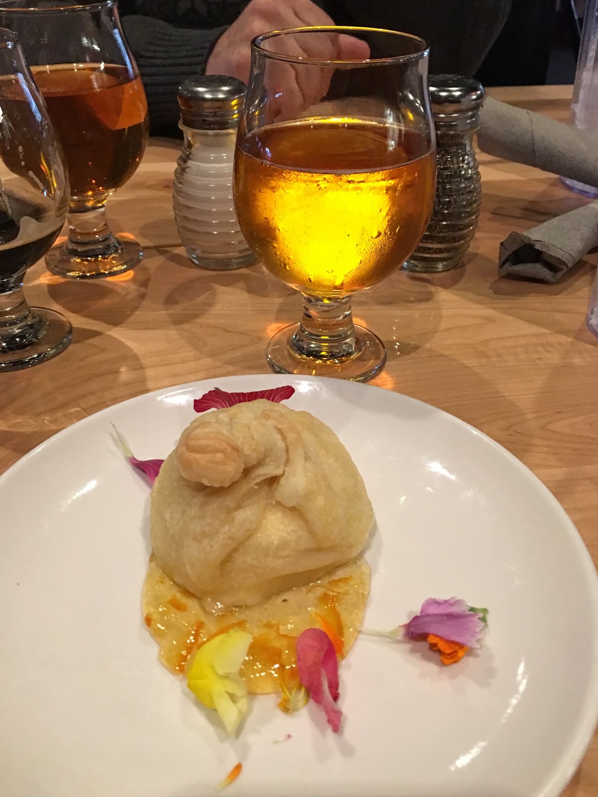 Barrel Aged Gonzo Imperial Porter finished the evening served with "Smoked Salt and Coffee Crusted Wings." The Coffee-brined and Coffee-herb-rubbed baked wings had a Smoked Salt and Maple glaze. The beer by itself provided rich coffee, chocolate and bourbon notes. When paired with the roasted coffee and salt encrusted wings, the combination was amazing. Despite my preference for hoppy beer and spicy food, this combination the winner of the night in my opinion.