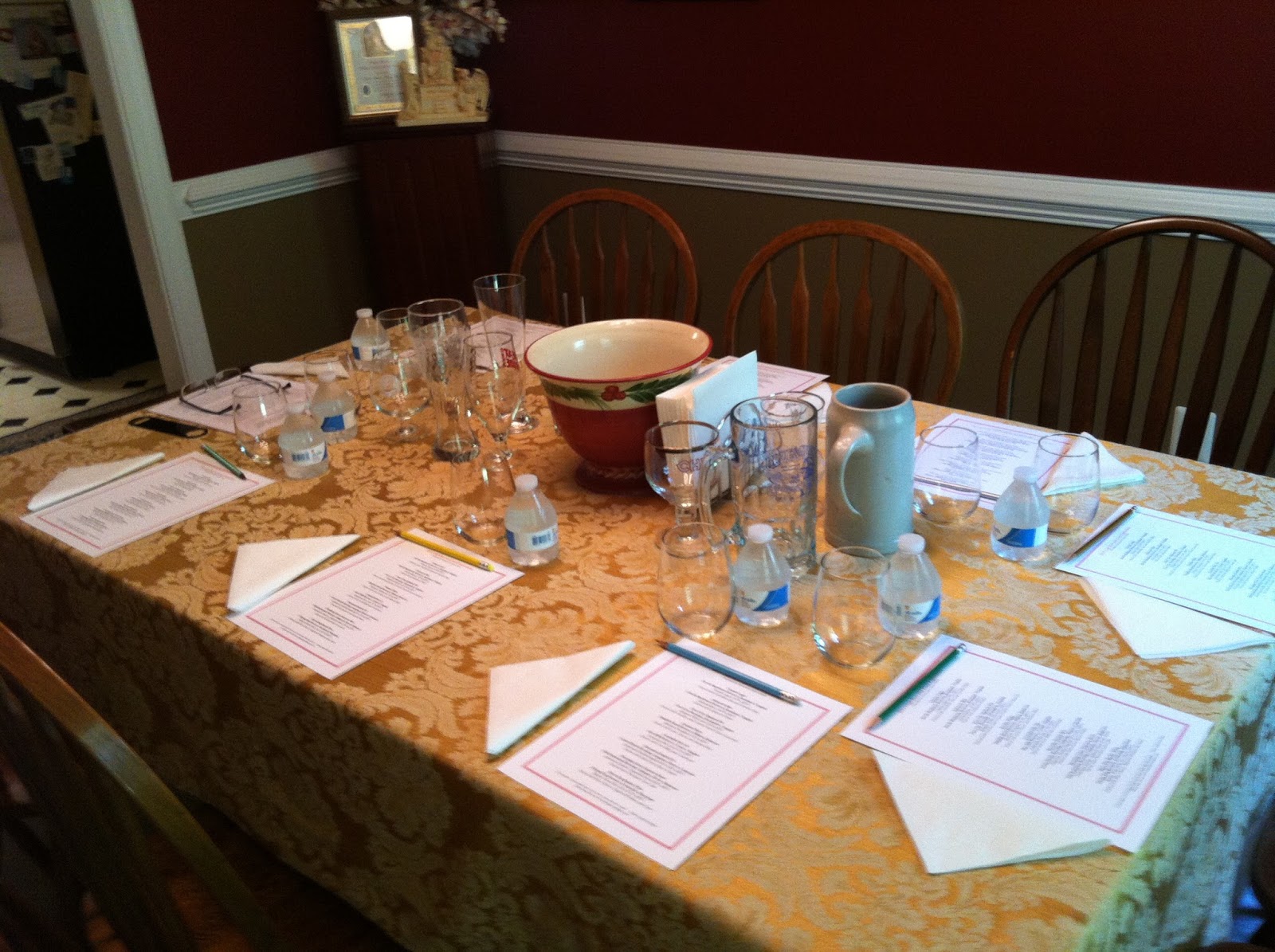 We had eight people in for the tasting. Over the course of 4 hours we enjoyed eight different beers accompanied by eight different plates of food. I picked beers that showed the wide range of flavors available in craft beer, and purposefully selected beers that are easily found in the area. Colleen did an excellent job with the food. After deciding the type of food we wanted with each beer, she searched for recipes. One of the things that makes this exciting, is that she also uses this as an opportunity to try new recipes, so most of the recipes we've not had before. The menu pairings are based on our prior experiences with beer and food. With few exceptions, we don't repeat things we done previously. If I do say so myself, this menu was one of the best we've put together. All the combinations worked very well, and a few of the pairings were especially notable.